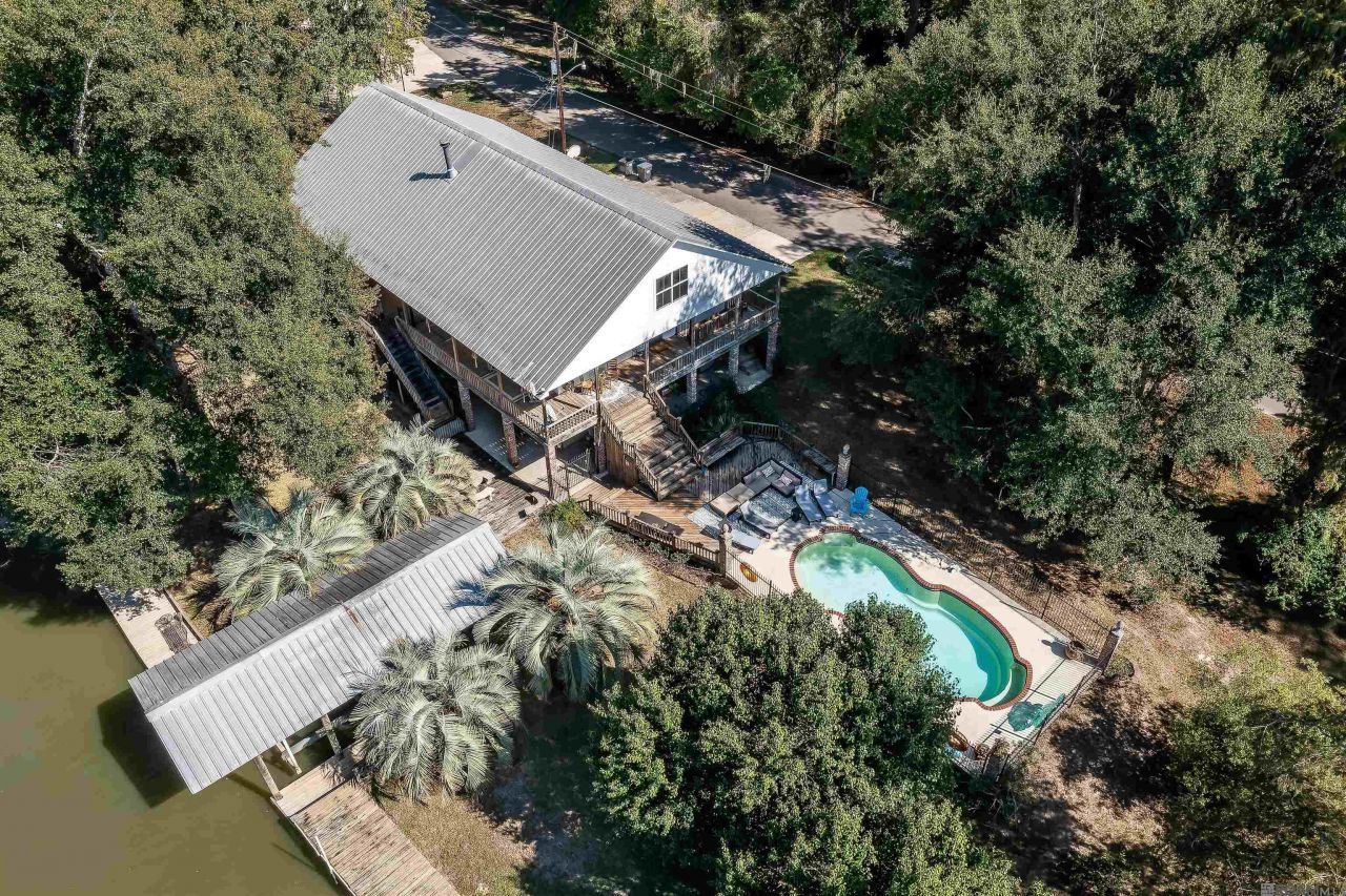 If you want to enjoy and find peace in your life, this home is it. Waterfront views from almost the entire home. It sits on four beautiful lots and has an in ground pool. A covered boat lift and ample dock space to fish from, there is a covered balcony area which surrounds the home. There are 3 patio areas and a covered cooking area. The kitchen is fully equipped with double ovens an induction cook top and so much more. You will see room sizes, however it is a large open floor plan. Beautiful fireplace in the den with built-ins. The inside was freshly painted. With a good offer most of the furniture and some of the other furnishing will remain. No carpet in this home beautiful wood floors except ceramic in the bathroom and kitchen. Beautiful wet bar for perfect entertaining. There actually is a heated and cooled downstairs bedroom/office and full bath. The wrought iron fencing around the pool is being replaced as we speak, the entire outside of the home including the patio area were just pressure washed. Just too many amenities to list. Measurements not warranted by Realtor, Seller, Broker.