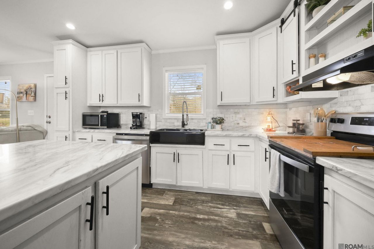 Modern luxury on nearly one acre - Flood Zone X (no flood insurance required.) Blending modern style with the space you've been looking for, this stunning, like-new 2022 residence is situated on a spacious lot. Designed with an expansive open-concept floorplan, this 3-bedroom, 2-bathroom home is the ultimate space for gathering and entertaining. The heart of the home is the chef-inspired kitchen, featuring a large center island, contemporary finishes, and ample cabinetry?perfect for hosting. The primary bathroom features a large soaking tub, separate shower, and dual sinks. Retreat to the outdoors and enjoy the peace of your back porch or the convenience of the massive 20x40 attached carport. Premium features include a metal roof for long-term peace of mind, privacy fencing on the highway side. limestone driveway and expansive carport area.