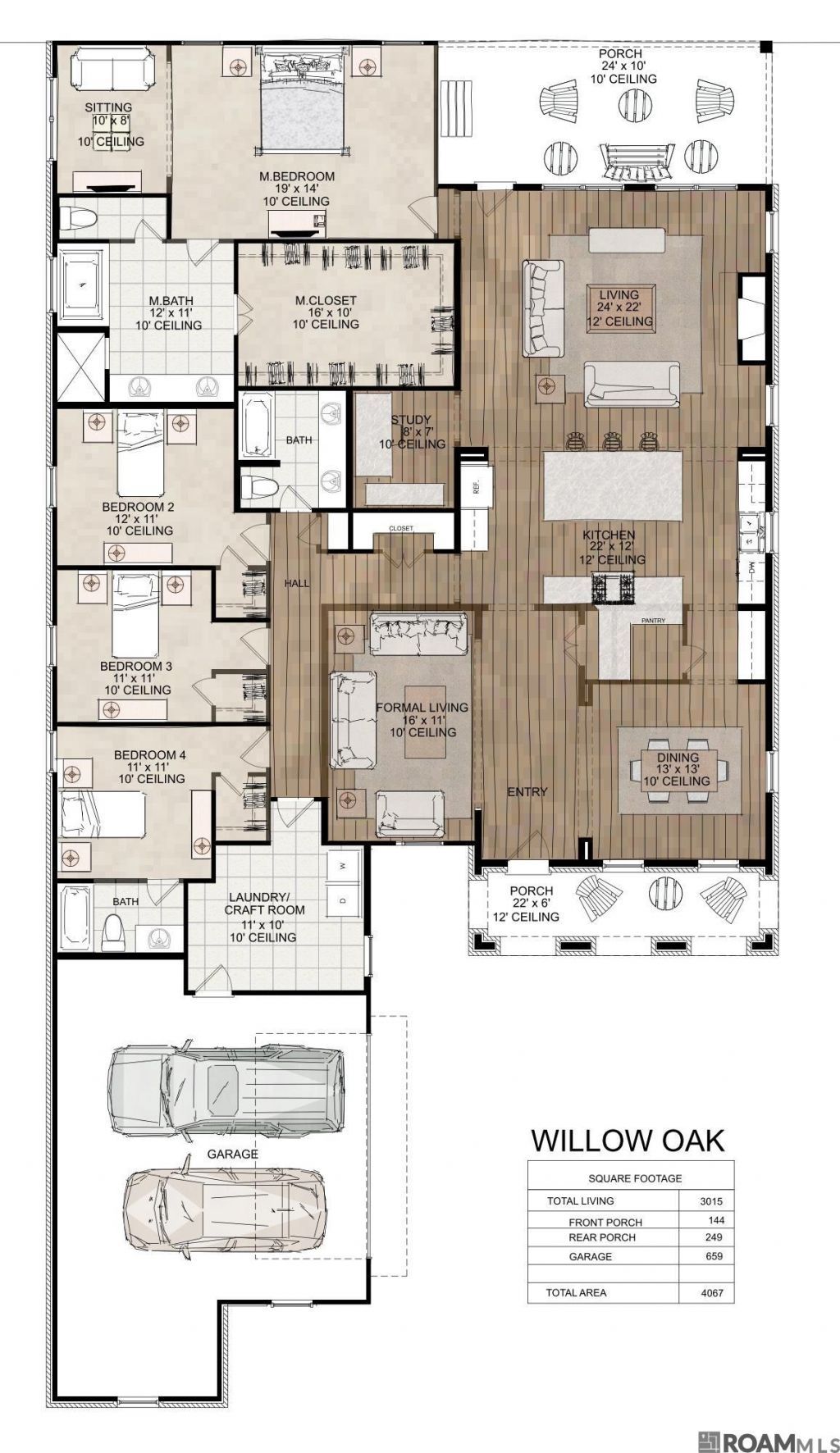 Welcome to The Willow Oak, a spacious and thoughtfully designed single-story home featuring 4 bedrooms, 3 bathrooms, a formal living room, study, and sitting area. With open, airy living spaces and 12-foot ceilings throughout, this home offers both elegance and functionality. Upon entering, you'll be greeted by a formal living room, located off the foyer entrance and across from the formal dining room. The formal dining area, with its soaring 12-foot ceilings, has pass-through access to the kitchen, which features a walk-in pantry for extra storage. The rear living room is a warm and inviting space, highlighted by a 36 ventless gas fireplace and a wall of windows that offer beautiful views of the backyard. This living area flows seamlessly into the gourmet kitchen, which is perfect for both everyday living and entertaining. The kitchen is a chef's dream, boasting kitchen cabinets that reach to the ceiling, upgraded countertops, a large island, GE stainless steel smart appliances, a 4-burner gas cooktop, a separate wall oven, and a walk-in pantry. The private master suite offers a luxurious retreat, complete with an en-suite bathroom featuring dual vanities, a tiled walk-in shower, a garden tub, a water closet, and a generous walk-in closet. Additionally, the master bedroom includes an attached sitting area/flex space, perfect for relaxation or a private home office. Throughout the home, 3cm granite countertops are featured in both the kitchen and bathrooms, adding a sophisticated touch to every room. A separate study/office, conveniently attached to the living area, offers a quiet space for work or creative pursuits. All bedrooms include walk-in closets, ensuring ample storage. Additional coat, linen, and hall closets provide further organizational options. The home is finished with a combination of LVT, oversized ceramic tiles in key areas, and plush carpet in the bedrooms. Bedroom 4 offers its own private en-suite bathroom for added convenience and privacy.